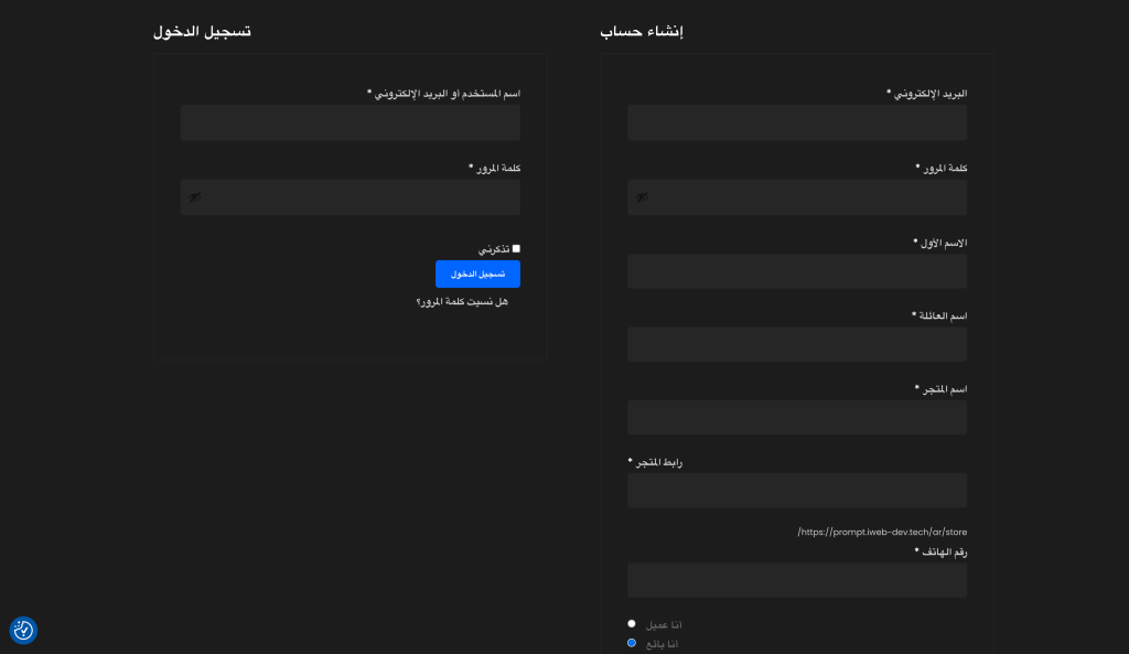 اذهب إلى صفحة التسجيل واختر “أنا بائع”. املأ اسم المتجر والبريد الإلكتروني وكلمة المرور.