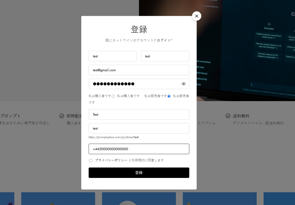 [出店者登録ページ]にアクセスし、「私は出店者です」を選択します。店舗名、メールアドレス、パスワードを入力します。
